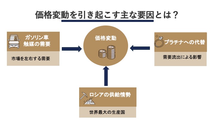 - 価格変動の要因は主に「自動車需要」「ロシアの供給」「プラチナへの代替」の3点であり、特に自動車産業の脱炭素化が決定的な影響を与えます。