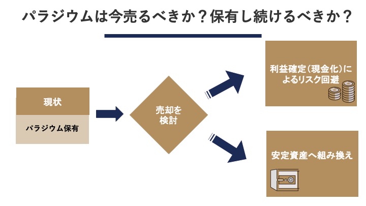 ここまで見てきた市場環境を踏まえると、保有しているパラジウムをどう扱うべきか、ある程度の方向性が見えてきます。投資判断は自己責任となりますが、一つの考え方として提案します。