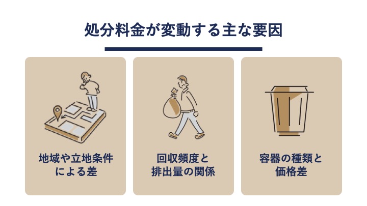 同じような規模のクリニックでも、A院とB院で処理費用が倍近く違うというケースは珍しくありません。なぜこのような差が生まれるのでしょうか。相場を知るだけでなく、料金が高くなる要因や安くなる要因を理解しておくことで、自院のコストが妥当かどうかを判断する物差しになります。主な変動要因は、地域性、回収条件、そして使用する資材の3点です。
