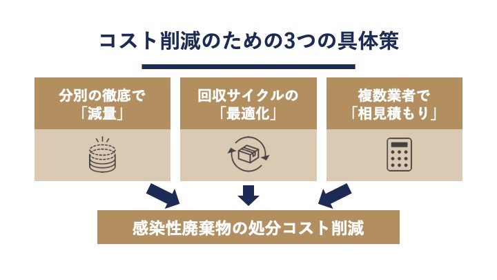 ここまでは相場や仕組みについて見てきましたが、ここからは実際にコストを削減するためのアクションプランについて解説します。業者に値下げ交渉をする前に、まずは自院でできる工夫を行うことが先決です。適正な処理を行いながら、無駄な支出を抑えるためには、「分ける」「減らす」「比べる」の3つのステップが有効です。