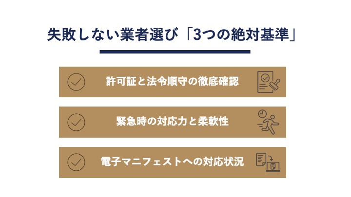 - 信頼性を重視する:安さだけでなく、許可証の有無や電子マニフェスト対応など、コンプライアンス面を必ず確認する。