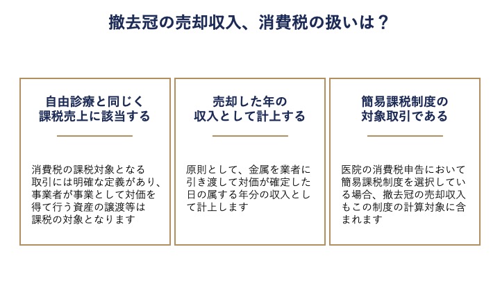 - 撤去冠の売却収入は消費税の課税売上となり、簡易課税制度の計算対象に含まれます。