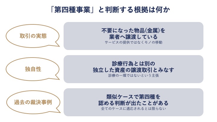 撤去冠は、治療の過程で患者さんの口腔内から取り外されたものであり、その所有権は本来患者さんにあります。多くの歯科医院では、患者さんから不要物として廃棄や処分を依頼され、所有権が医院に移転した後に売却を行います。この流れを重視すれば、医院は取得した「金属という物品」をリサイクル業者へ譲渡していることになります。サービスの提供を主とする第五種事業とは異なり、モノの譲渡を主とする取引であるため、第四種事業に該当するという解釈が成り立ちます。