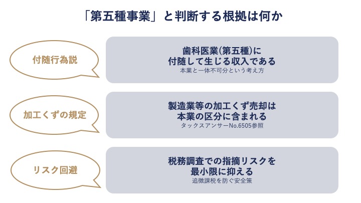 | 付随行為説 | 歯科医業(第五種)に付随して生じる収入である | 本業と一体不可分という考え方 |