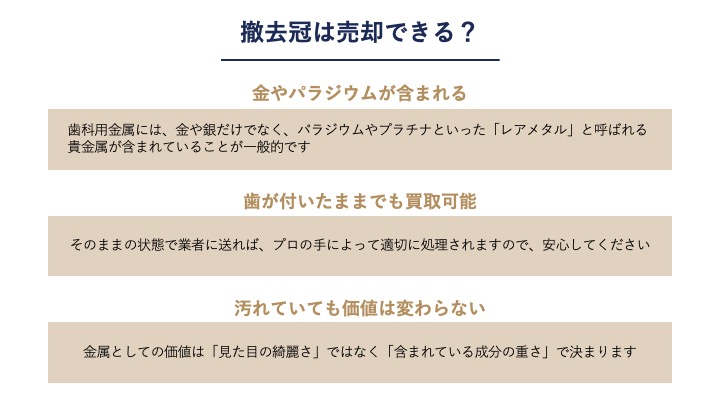- 撤去冠には金やパラジウムなどの価値ある貴金属が含まれており、歯がついたままや汚れた状態でも専門業者に売却可能です。