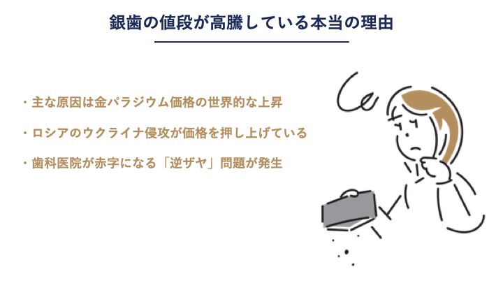 - 銀歯の価格高騰は、金・パラジウムの国際価格上昇や円安が主因であり、今後も高止まりが予想されます。