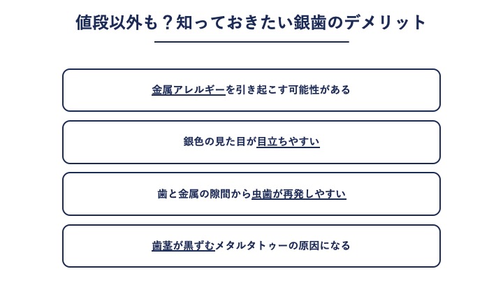 費用が高くなっている銀歯ですが、実は値段以外にも考慮すべきデメリットがいくつか存在します。長年使われてきた実績のある素材ではありますが、お口の健康や見た目を考えると、必ずしも最良の選択とは言えない側面もあります。ここでは、コスト面以外で知っておくべき銀歯のリスクについて整理します。
