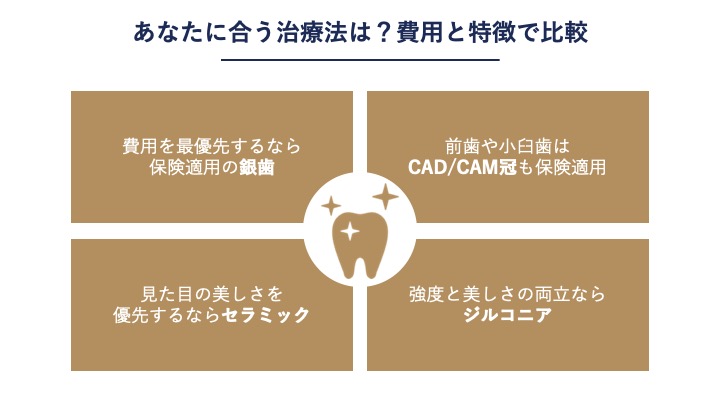 - 費用を抑えたいなら保険適用の「銀歯」や「CAD/CAM冠」、審美性や耐久性を求めるなら自費の「セラミック」や「ジルコニア」が選択肢となります。