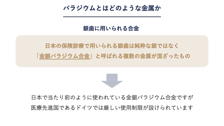 - 日本の銀歯に使われるパラジウムは海外では使用制限がある金属である