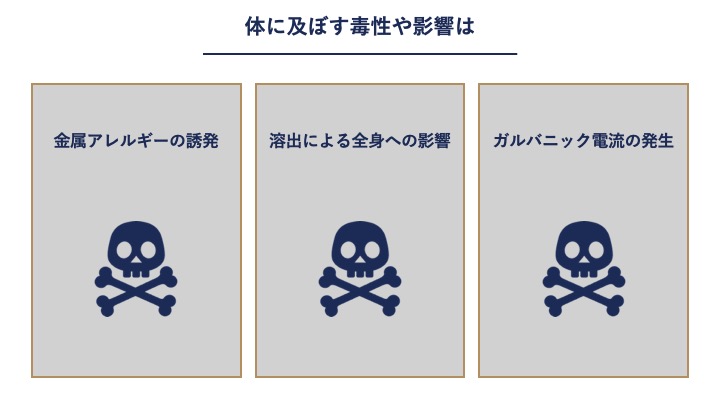 - 唾液で溶け出した金属は全身に回りアレルギーの原因となる