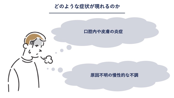 最も分かりやすい症状は、直接金属が触れている口の中や、蓄積されやすい皮膚の表面に現れる炎症です。