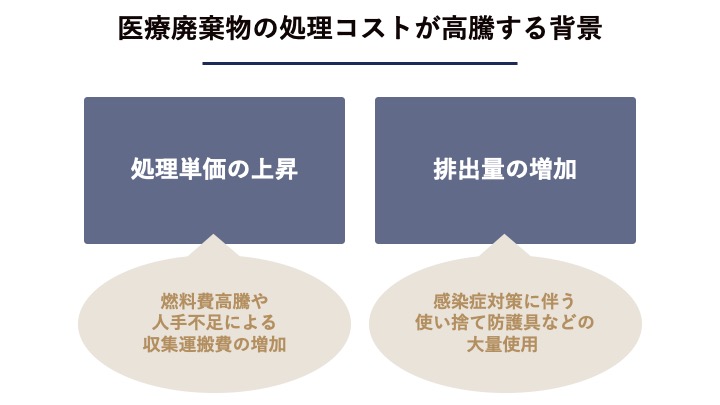 医療廃棄物のコスト高騰は、燃料費などの外部要因による単価上昇と、感染対策による排出量増加という二つの背景によって引き起こされています。