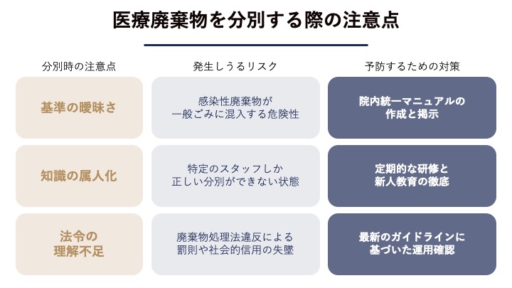 分別ルールの形骸化を防ぐには、医師や看護師から清掃スタッフ、事務員に至るまで、廃棄物を扱う全員が迷わず行動できる明確な基準づくりが不可欠です。